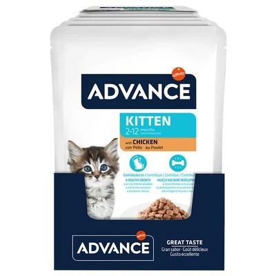 Advance Kitten con pollo es una comida húmeda indicada para gatos de hasta un año de edad. Está compuesto por una combinación equilibrada de nutrientes adecuados a las necesidades de los gatitos en etapa de crecimiento, para ayudarles a crecer adecuadamente. Se prepara con ingredientes de calidad cocinados cuidadosamente al vapor, de modo que se conservan mejor sus cualidades y su sabor. La textura tierna de los pedacitos de pollo en salsa resulta fácil de masticar y digerir para los gatitos.