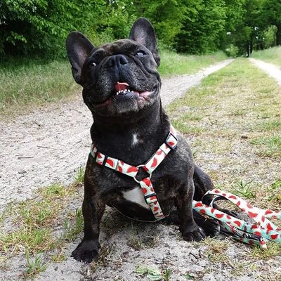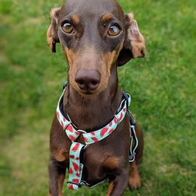 Arnés para perros ajustable en 4 posiciones. De neopreno y poliéster, muy resistente, estructura de 2 capas. Con 2 anillas semicirculares y cierres de clic extrafuertes. Diseño: sandías.