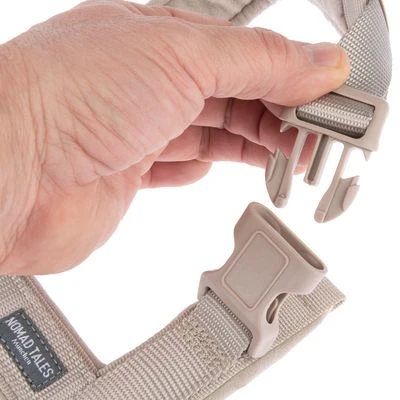 La hebilla fácil de usar ayuda a poner y quitar el arnés Nomad Tales Blush beis topo de forma rápida y fácil. Si se ensucia después de una divertida aventura, basta con limpiarlo en la lavadora. Su diseño de colores neutros, así como el bonito colgante y el parche con el texto «Nomad Tales», completan el arnés para convertirlo en un compañero único.