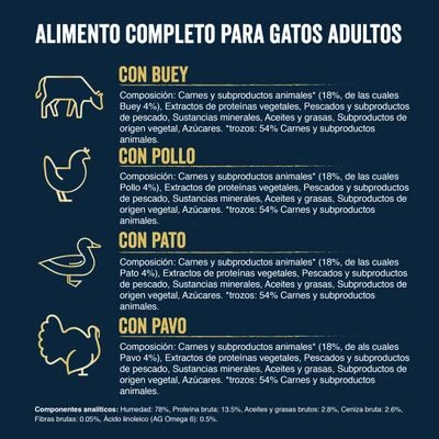 Deliciosas tiras de carne o pescado en salsa que conquistarán el paladar de tu minino. Alimento completo y equilibrado que proporciona a tu gato gato adulto todos los nutrientes que necesita. Con vitamina D y E y ácidos grasos omega-6.