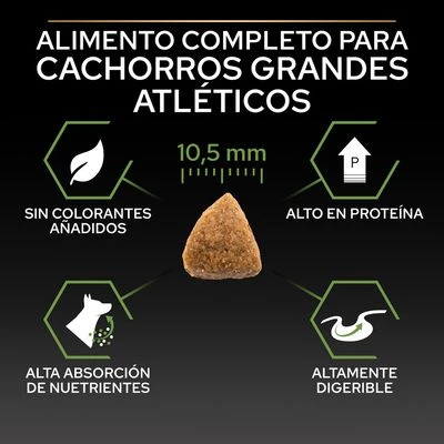 - Sabroso pienso para cachorros atléticos de raza grande (a partir de 25 kg) hasta los 24 meses.